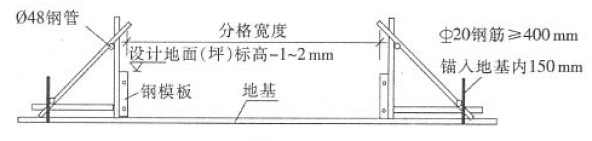 布网钢筋采用膨胀螈栓焊接法,并按设计比例规格沿棍宁图浇灌方向排列,实现基层稳固高度固定,减少后期开裂,之后采用线绳矫正钢筋的水平高度和水平直度。在混凝土支模的过程中,用粘玻璃条替代钢模板,在地幔厚度较大的情况下,使用通条固定。其只设方法如图2。