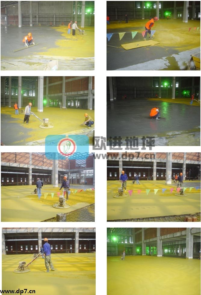 业主及设计根据不同使用功能要求选用不同类型的骨料耐磨地坪。旋工工艺为:在初凝的混凝土表面均匀撒布耐磨骨料.机械压平、收光.伸缩缝处理,养护硬化地面。
