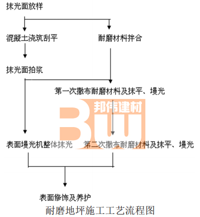 硬化剂材料分骨料和胶结物两种成分。骨料为砂状,平均粒径 1.5mm,约占总量 60%;胶结物为经处理的高标号水泥,除采用水泥本色外,还有红、黄、绿、灰等多种色彩可供选择。硬化剂骨料成分为天然矿石。系不生锈的非金属性骨料,硬度在莫氏 8 度以上。除天然矿石骨料外,其他水泥、色料等重量不超过总重量的 25%。耐磨材料用量根据材料说明书和设计要求确定。
