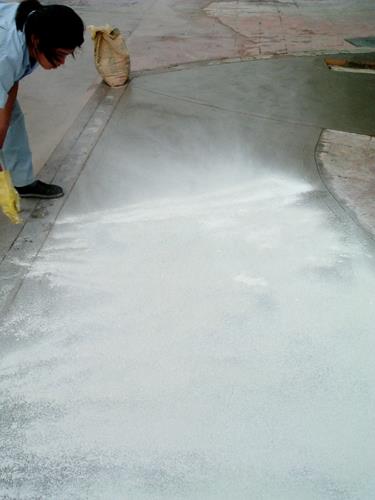 (步骤一 混凝土收光) (步骤二 撒压膜材料)