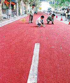 位于南京市洪武南路路口至中山南路路口的南京首条彩色道路不久前铺设完毕并通车,该彩色道路全长200米。这条彩色道路是用一种高分子树酯稀浆涂抹于路面,并撒上耐磨的彩色陶瓷颗粒铺设而成。彩色道路不仅美化了路面,而且更有利于交通安全。该路防滑、美观,可以随意改变色彩,一改以往南京清一色柏油马路的状况。