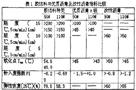 针入度、软化点、延度的实验均按照交通部行业标准JTJ052.2000进行。通过大量的实验,分析得出:胶结料的粘结性随石油树脂与基础油的比例的提高而增加.表现在针入度值的减小.但胶结料的低温柔韧性降低,表现在当量脆点值的升高;随着聚合物A的掺入,胶结料的温度敏感性得到改善.低温柔韧性得到提高:随着聚合物B的掺入.胶结料粘度增大.软化点升高而且低温延度得到大幅度提高。值得一提的是.在影响针入度值的闲素中.石油树脂与基础油的比例是主要因素。因此可以通过调整两者的比例配制得不同标号的胶结料。实验制得90#与110#的胶结料,其指标见表1.