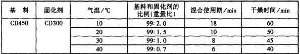 (一)预混:按比例将固化剂CD300加入基料CD450中.立即用电动搅拌机低速搅拌均匀,混合比率、混合使用期及干燥时间随温度变化,温度低时适量增加固化剂,温度高时适量减少固化剂,参考数据如下表: