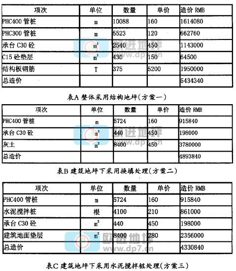 方案一:整体采用结构地坪。柱下基础采用直径400(壁厚95)的PHC预应力混凝土管桩,地坪桩采用直径300(壁厚7o)的PHC预应力混凝土管桩,桩基承台及架空地坪结构板采用C30现浇商品混凝土,承台垫层采用C15现浇商品混凝土,桩基承台及架空地坪结构板钢筋采用三级钢。