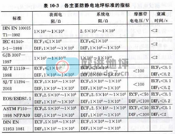 各个国家、各个组织制定防静电地坪的标准稍有不同,但基本上都是按照地坪的电阻指标来界定的,表为各主要防静电地坪标准的指标。