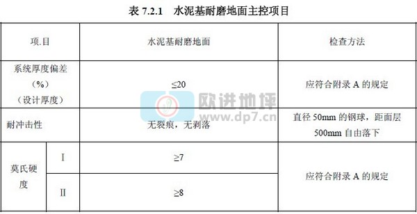 水泥基耐磨地面主控项目的验收应符合表 7.2.1 的规定。