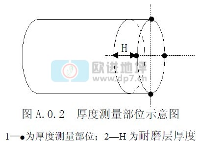 测量耐磨层厚度时,应将芯样放置在温度(20~25)℃、湿度(45~55)%的环境中干燥;芯样干燥后,随机抽取两条互相垂直的直径,从芯样外侧测量这两直径与圆周四个交点处的部位的 H(图 A.0.2),以 4 个测量值的算术平均值表示该芯样的耐磨层厚度,测量和计算均精确到 0.1mm。