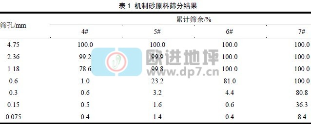 耐磨地坪砂浆中骨料使用的是不同型号的机制砂,其筛分级配表1 所示。