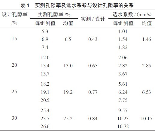 试验采用粒径为10~20 mm 的碎石,设计透水混凝土的孔隙率为15%、20%、25%和30%时,研究设计孔隙率、实测孔隙率与透水系数的关系,试验结果见表1 及图1。