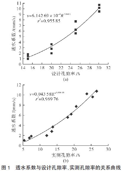由于进行透水混凝土的配合比设计时,透水系数并不能直接通过配合比设计确定。虽然孔隙率是反映透水混凝土透水系数的一个重要指标,但孔隙率与透水系数并不存在对等关系,其他一些因素比如孔隙的特征、大小及孔隙的路径走向等,对透水混凝土的透水性能也有着不可忽略的影响。因此,探讨孔隙率与透水系数的关系对透水混凝土配合比设计具有重要意义。
