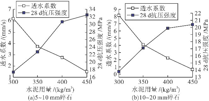 从图3 中可以看出,不论使用哪种石子,透水混凝土的抗压强度皆随水泥用量的增加而增加,而透水系数则随着水泥用量的增加而减小。在相同水泥用量的情况下,对比两种不同粒径的碎石可发现,使用5~10 mm 的碎石配制的透水混凝土抗压强度值较高,但透水系数较低,而10~20 mm 的碎石得到的相反结果。使用大粒径骨料配制的透水混凝土抗压强度较低,主要是因为骨料粒径越大,骨料间的咬合点越少,由此产生的咬合摩擦力及其与水泥浆体的黏接力减少所致。因此,进行透水混凝土的配合比设计时,有必要把“骨料级配与粒径”作为一个设计参数,根据设计要求选择合适的骨料级配与粒径,才可得到透水系数和抗压强度相匹配的透水混凝土。
