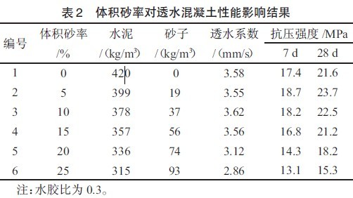 由表2 中可知,体积砂率在0~15%范围内透水系数变化较小,当体积砂率超过15%时,透水系数明显下降。这主要是因为,在配合比设计中,砂子等体积取代水泥,透水混凝土的孔隙率保持不变,因此其透水系数随着体积砂率的变化较??;但体积砂率超过一定值后,由于骨料的级配得到改善且砂子堵塞透水混凝土孔隙的几率增大,从而导致透水系数下降。