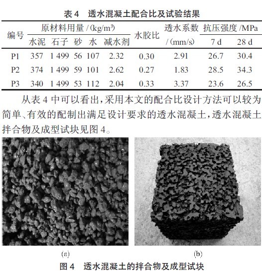 (6)另选择0.27、0.33 两个水胶比,按照上述步骤进行配合比设计,透水混凝土配合比及试验结果见表4。