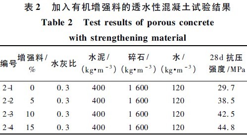 在编号1-4 配合比的基础上,分别加入水泥用量5%,10%, 15% 的标美彩石产着色增强料,以了解透水混凝土强度的变化。试验结果如表2 所示。
