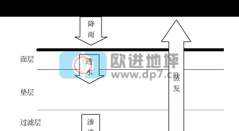 透水性铺装包括透水性沥青混凝土铺装、透水性水泥混凝土铺装及透水性地砖等;我国传统的用于园林铺地的鹅卵石地面铺装也是透水性铺装的一种。透水性铺装的透水一般方式就是地面上的降水可以通过面层与其铺装下垫层相通的渗水路径渗入下部土壤;另一种透水方式是依靠地砖接缝或地砖之间预留空隙来实现透水目的[3]。